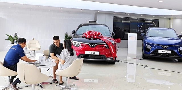 Khách hàng tìm hiểu mua xe VinFast tại showroom ô tô ở TP.HCM - Ảnh: CÔNG TRUNG