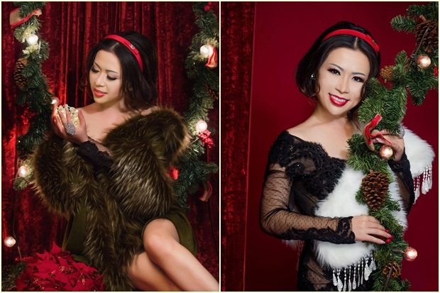 Phong cách trang điểm nhẹ nhàng kết hợp với mái tóc bob trẻ trung và son môi màu đỏ nổi bật khiến gương mặt hoa hậu Kristine Thảo Lâm thêm phần rạng ngời và xinh tươi rạng rỡ trong bộ anh Giáng sinh.