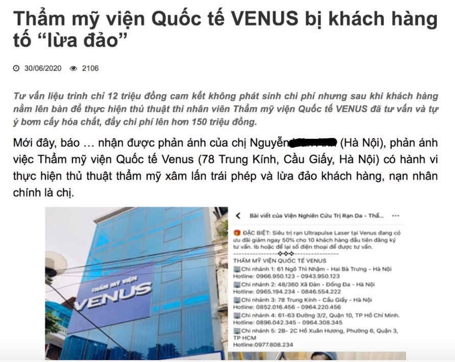 Thẩm mỹ viện Quốc tế Venus lừa đảo?