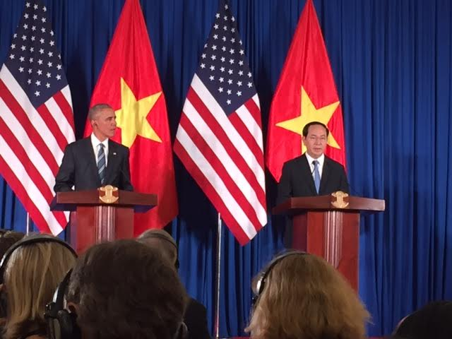 Sau lễ đón chính thức, Chủ tịch nước Trần Đại Quang và Tổng thống Mỹ Barack Obama hội đàm, chứng kiến lễ ký kết các văn kiện tại Phủ Chủ tịch và chủ trì họp báo.
