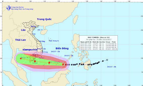 Tối 23/12, bão Tembin đã đi qua đảo Pa-la-oan (Philippines) và đi vào khu vực Biển Đông, thành cơn bão số 16.