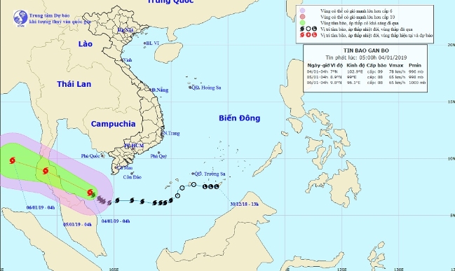 Hồi 4 giờ ngày 4.1, vị trí tâm bão ở khoảng 7,0 độ vĩ bắc; 102,9 độ kinh đông, cách mũi Cà Mau khoảng 260km về phía tây nam. Sức gió mạnh nhất vùng gần tâm bão mạnh cấp 9 (75-90km/giờ), giật cấp 12. Bán kính gió mạnh cấp 6, giật cấp 8 khoảng 130km tính...