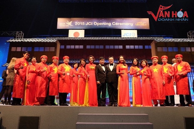 Doanh nhân Hùng Cửu Long (giữa, áo dài đỏ sao vàng) tại sự...